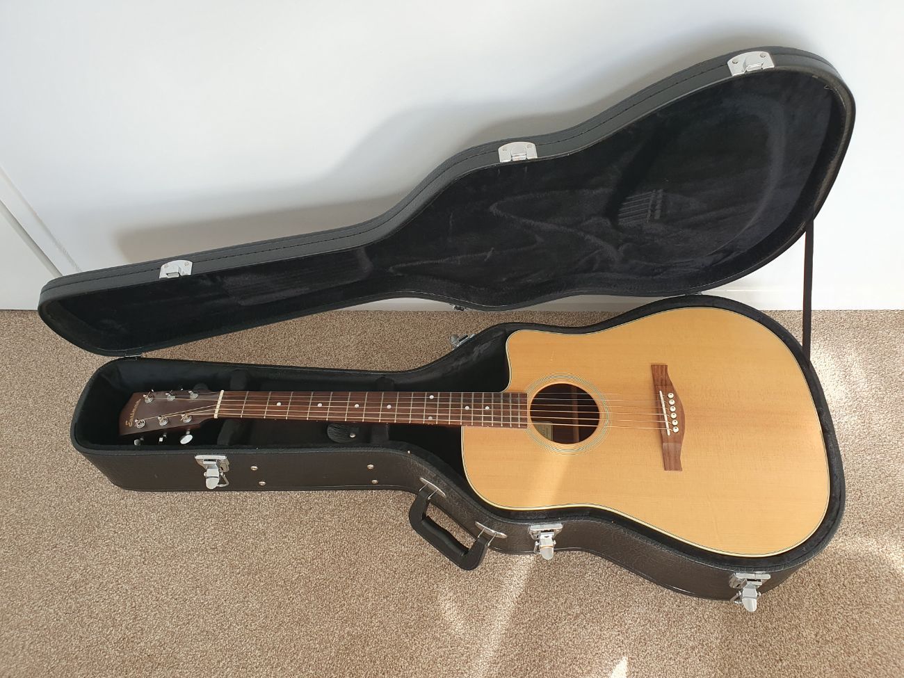 Eastman electro-acoustic guitar including hard case, capo