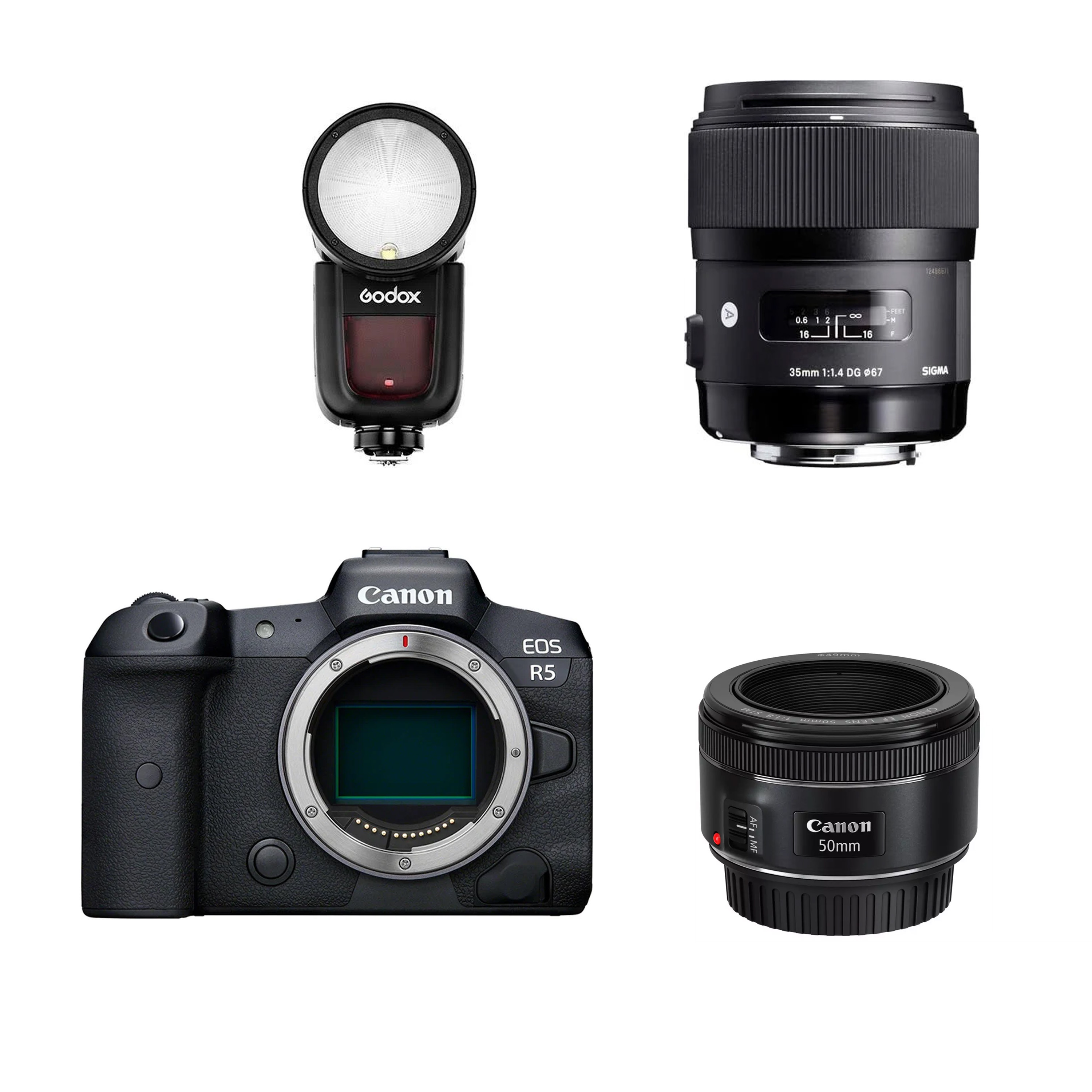 Canon r5 with godox v1-c flash, sigma 35mm f1.4 and canon 50mm f1.8 (with rf to ef mount)